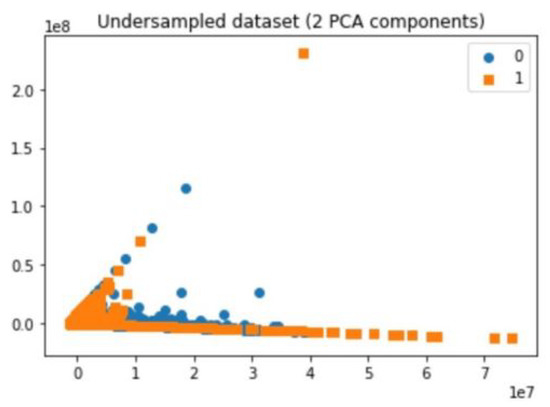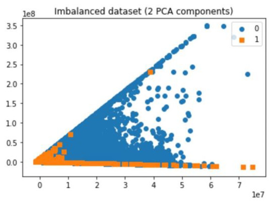 In order to prevent the curse of data imbalance, the data were explored to see the distribution before proceeding with the model development. The dataset consist of a negative class (0) made up of 99.8709% and positive class (1) made up of 0.1290%. A 2 Principal component analysis (PCA) representation of the dataset is presented in Figure 2. This shows a very high level of data imbalance in the dataset and any model developed with this dataset without any sampling technique will be biased towards the negative class. In this paper, a model with the original dataset was first developed without performing any sampling on the dataset. Two (2) undersampling procedures namely NearMiss and RandomUnderSampling, two (2) oversampling procedures RandomOverSampler and SMOTE, and a combination of both for the classifiers SVM and NB were performed. That is, five (5) experiments were performed for SVM and fifteen (15) for NB; five (5) for GS, BN, and MN. DT however, can handle the problem of class imbalance so the experiment was performed on GBDT using the original dataset without any sampling but was carried out with optimized hyperparameters.
