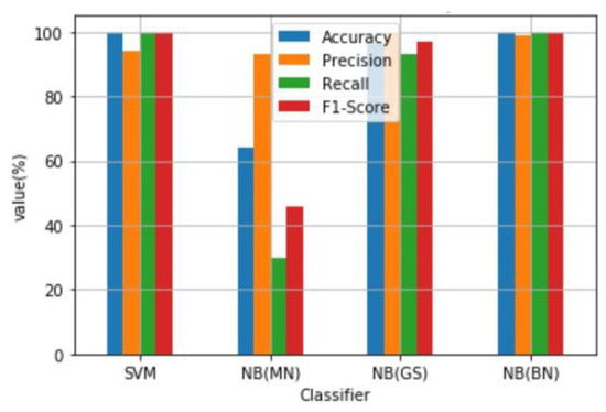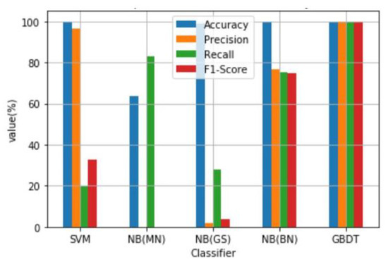 A cross-case analysis of our results are performed. Table 4 present the results of the experiment performed on the unsampled dataset. Even though the algorithms produced accuracy score in the range of 63.83% for Naïve Bayes (NB) using Multinomial (MN) to that of SVM of 00.91% which are pretty good, the F1-Scores produced were discouraging with NB (MN) producing 0.00% and NB Bernoulli (BN) producing 74.97% giving the range for that measure. F1-Score is one of the most important metric use for measuring the performance of imbalanced datasets because of its ability to balance recall and precision [55]. The F1-Score from this experiment is an indication that the results produced from imbalanced dataset without any sampling procedure are unreliable. The precision produced mixed results with the lowest of 0.00% coming from NB (MN) and highest 96.49% from SVM. In all, if F1-Score is considered as the most important metric, then NB (BN) can be considered as the best performing algorithm followed by SVM, NB(GS) and the worse algorithm being NB(MN). However, less emphasis is laid on the results presented in Table 4 for the preferred classifier due to the imbalanced nature of the dataset. Table 5 presents the classification report from the experiment from the first undersampling process; RandomUnderSampler. This experiment produced fairly good results with the accuracy ranging from 57.97% for NB Gaussian (GS) to 88.97% for NB (BN). The precision also ranged between 54.00% for NB (GS) to 84.00% for NB (BN) and very good recall of 92.00% NB (MN) to 99.00% for NB (GS). We, again, consider NB (BN) as the best performing classifier in the experiment producing F1-Score of 90.00% and NB (GS), NB (MN), and SVM obtaining 70.00%, 80.00%, and 87.62% respectively. Moreover, due to the fact that a chunk of information was lost through this process via undersampling, less emphasis is laid on this result but presents for analysis to obtain a holistic picture of the experiment performed. Table 6 presents the classification report for the second undersampling procedure; NearMiss. Comparing the results obtained from RandomUnderSampling to NearMiss, it was observed that the results from NearMiss are superior to that of RandomUnderSampler with an exception to the results from NB (MN) obtaining 30.00% for recall and 46.00% for F1-Scorein NearMiss compared to that of 92.00% and 81.00% for RandomUnderSampler. The rest of the results produced quite good results; accuracy 64.27% to 99.65%, precision from 93.00% to 100.00%, recall of 30.00% to 100.00% and F1-Score of 46.00% to 100.00%. Under NearMiss, NB(BN)is considered as the best performing classifier, followed by SVM and NB (GS) with NB (MN) coming up again as the worse performing classifier. It is observed from the two undersampling methods that the result produced are quite significant. Also, NB(BN), SVM, and NB(GS) performed well in both two cases with NB(MN) being the worse. Again, little importance was attached from the results obtained from our undersampling procedures since the procedure has the effect of throwing away a chunk of information from the dataset. However, the results obtained from undersampling are quite good. Table 7 and Table 8 present the classification report from the two oversampling experiments namely RandomOverSampler and SMOTE respectively. We also present the report from Table 9 which is the report form the combination of undersampling and oversampling; SMOTETomek. The report from these three experiments produced some interesting results, with all three producing similar results with most having differences appearing only in the decimal range.The accuracy ranged from 49.87% for SVM, 57.9 % for NB (GS), 75.23% for NB (MN) and 88.97% for NB (BN). The F1-Score also ranged from 66.47% for SVM to 90.00% for NB (BN). The results are quite similar to the other oversampling procedure SMOTE. It was observed that NB(BN) continued with its dominance as the best performing classifier in all the above discussions producing the best results in comparison to the other algorithms, having achieved its lowest mark in accuracy of 88.97%, precision of 84.00%, recall of 96.00% and the highest of 90.00% for F1-Score. SVM which performed pretty well previously did not do so well in the oversampling process. Also, NB(MN) which performed poorly in the two undersampling methods performed well in the oversampling methods. Table 9 which is the report from SMOTETomek followed the pattern of the two oversampling methods. Table 10, presents the classification report from the experiment performed with gradient boosted decision trees (GBDT). This experiment produced a near perfect result for accuracy, precision, recall and F1-Score with the values of 99.90%, 99.99%, 100.00%, and 99.95% respectively.