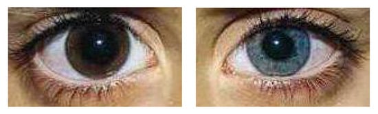 Heterochromia of the eye can sometimes be recognized by the naked eye. Thus, in the example shown in Figure 1, the blue eye is abnormal in terms of noticeably different iris color, which is also confirmed by other signs such as a smaller pupil and subtle drooping of the upper eyelid. In other cases, when the difference is subtle, visual identification can be severely limited. In these cases, an automatic method can be extremely useful for supporting medical diagnosis, which is in line with the approach proposed in this work.