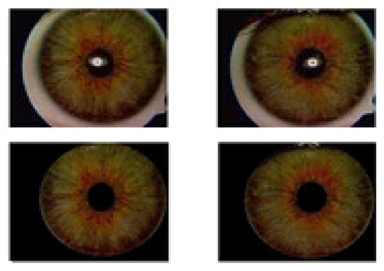 Example of the original right and left iris images (top panels) and their corresponding segmentation (bottom panels).