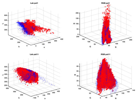 Since the property being scrutinized for use as a CH biomarker is conceptually simple (color differences between pixels from both irises), one might consider using simple statistics on the color image, but we found that it is not so straightforward. Figure 3a shows the histogram of the segmented irises for the red component (RGB space) in a control case (no CH). Example histograms for a patient with CH are given in Figure 3b. Note that the histogram shape for both irises is similar for the control case, as are their means and standard deviations. However, some differences may be observed in the CH example, both in the histogram shape and in their corresponding basic statistics. Nevertheless, simple statistics may not be sufficient for providing a good-quality biomarker. Figure 4 depicts the scatter plot of the iris pixels when using the three components of the color space (Lab and RGB color space in these examples), showing that complex joint distributions can be more informative. In addition, the joint distribution can change with the subject and with the color space. These observations represent the rationale for proposing a classification strategy from machine learning techniques.