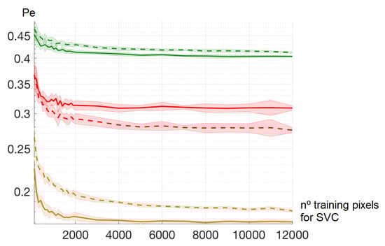 Study of the required number of training pixels for the machine learning classification, benchmarked on a control subject (green), on a different pathology (orange), and on a CH patient (red), when using support vector classifier (SVC; continuous) and k nearest neighbors (k-NN; dashed) classifiers. Shaded bands depict the mean ± standard deviation of 10 realizations.