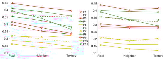 Figure 6 shows the comparison of input spaces as given by individual pixels and when extending to eight neighbors, and more neighbors (texture). Classifiers were trained and tested with 5000 and 10,000 samples, respectively. Results are shown for the Lab input space. The k-NN classifier showed a defined trend of bringing all the cases closer in terms of with increasing pixel neighborhood size, whereas the SVC was less sensitive to the increase of the pixel neighborhood. Nevertheless, there was a trend in some specific cases (specially for patient P4 in the figure) for which decreased despite being a control case. Thus, it can be concluded for this problem that feature spaces just associated with individual pixels are better suited than extended spaces considering neighborhood pixels.