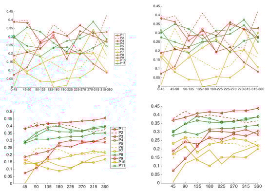 Figure 8 shows that the four patients in Group 3 (P5, P6, P7, and P10) generally exhibited a noticeably reduced , which was consistent throughout all angles, although for some sectors their was increased. In general terms, the concatenation of all sectors softened the and made it constantly low. Additionally, the three healthy subjects in Group 2 showed a consistently increased , both in every sector (with some occasional drop in ) and in the accumulated figure.