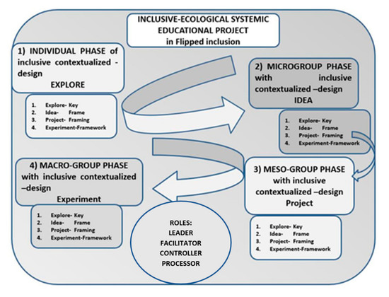 The Flipped Inclusion design model (Figure 1) is organized in four sequential macro-transformative phases [70], ordered by descending logic - top down - with the didactic-design application of frame analysis, and bottom up, with transversal cooperative organization, in a systemic ecological system ascending perspective. The macro-project architecture of the Flipped Inclusion model envisages simple levels of cooperation, organized in phases of increasing complexity of the work: (1) individual; (2) in micro-groups of participants (with four components and four roles); (3) role mesogroup (leaders, facilitators, processors, controllers); (4) context macro-group (by class / course / school).