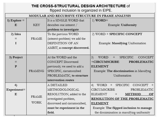 - promotion of inclusive, ecological and systemic prosocial contexts. The design architecture is organized in modular and recursive medium empowerment paths [59], which pursue the cross-media logic of crossing between different approaches, transposed didactically. Frame analysis [60] is applied as a top down approach; while the systemic ecological inclusive perspective [61] is transposed and organized in bottom up mode, with intergroup peer-empowerment-cooperative paths, to educate on the observation of inter-agency between contextual factors, from micro to macro-structural [34], which trace the complexities of the network and the management of the inputs and dynamics that are expressed in the technological habitat. A modular and recursive systematic application of an EIPE (stands for Explore-Idea-Project-Experimet) matrix-process is foreseen, which declined in top down design logic, through a didactic transposition of the frame analysis [60] and in bottom up, taking into account Gee’s learning principles [25]. In particular, the following phases: