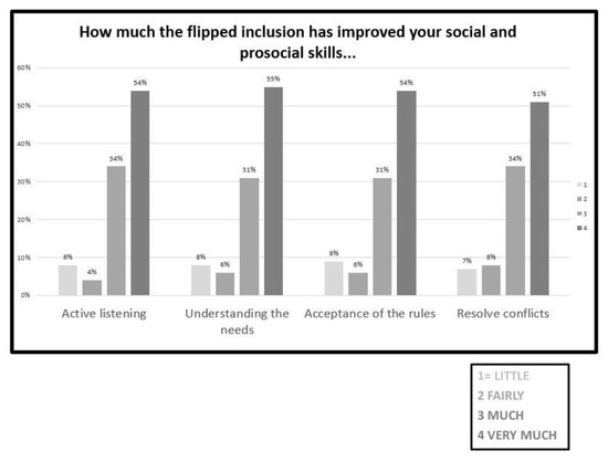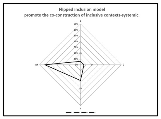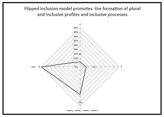The flipped inclusion model, with an ergonomic–anthropocentric didactic approach [33], therefore, aims at inclusive, ecological–systemic well-being [34], through computational logic operating procedures, organized in systematic and systemic design architectures, to encourage the acquisition of inclusive prosocial skills.