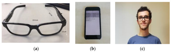 The EC glasses consist of a sensorized frame of glasses (Essilor International S.A., Prais, France) embedding a magneto-inertial measurement unit (Bosch Sensortec GmbH, Reutlingen, Germany), a UV sensor (Vishay Intertechnology, Inc., Malvern, PA, USA), a rechargeable battery and a Bluetooth module inside the left temple (weight: 26 gr, size: 13.5 × 3.5 × 14 cm). The Bluetooth antenna allows the transmission of the acquired data to a dedicated mobile app (i.e., Zero mApp, Essilor International S.A., Prais, France) compatible with both Android and iOS environment. The Zero mApp analyzes the sensors’ data, to provide, in real time, the number of steps. The EC glasses, the Zero mApp and the EC glasses worn by a subject are represented in Figure 1a–c, respectively.