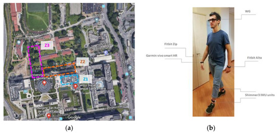 Subjects were asked to follow a predefined path, including walking activities in different contexts, at the San Raffaele Hospital, in both inside and outside environments (Figure 3a), while wearing the EC glasses, two Shimmer 3 IMUs at the ankles, Fitbit Zip at the waist, Fitbit Alta at the left wrist and Garmin vivo smart HR at the right wrist (Figure 3b).