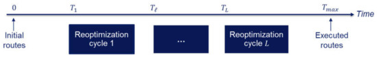 The allocation of DO to the fleet vehicles is dealt through periodic re-optimization (see Figure 1). It is assumed that in the overall planning horizon there will be re-optimization cycles, each corresponding to an appropriate “static” problem , with re-optimization occurring at time instances where . Re-optimization cycles ( ) may or may not be of equal duration. The “static” problem solved at each re-optimization time considers all information known up to the related point in time. It is assumed that problem is solved instantaneously.