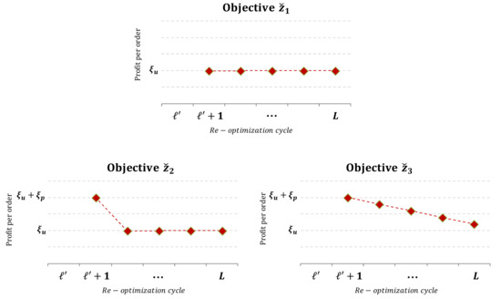 As already discussed, forcing as many orders as possible to be served until time may cause higher routing costs, compared to scenarios in which orders may be served at an appropriate time. Objective function , already mentioned above, moderates this effect by encouraging orders to be served early, but even beyond . Objective has a similar structure to that of objective , but assigns to each served order a revenue that decreases linearly depending on the period (re-optimization cycle) the order is served (as in Figure 2).