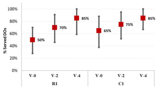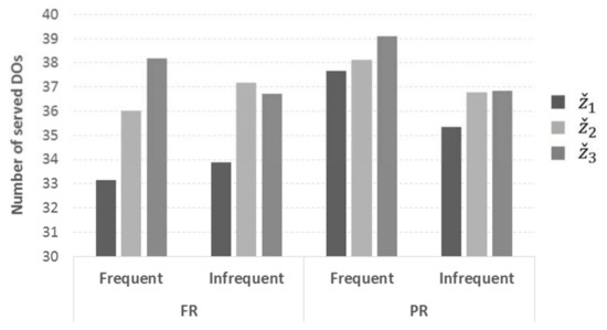 In order to put the aforementioned analysis into context, Figure 9 presents the average performance of the three objectives in terms of number of DO served in those cases that favor objectives and (according to previous analysis), i.e., (a) case V-4 regarding vehicle availability (where on average 85% of the DOs can be served); and (b) instances R104, R108 and R100 (those with wide or no TW). Results are reported with respect to re-optimization tactic and frequency; for the latter, FTR-10 and FTR-20 are grouped under category “Frequent” and FTR-40 and FTR-60 under category “Infrequent”. The figure illustrates that, as discussed previously, objective is more appropriate for frequent re-optimization under the FR tactic, offering up to about 15% more DO served; this is limited to about 4% when the PR tactic is employed. On the other hand, objective seems to perform best under infrequent re-optimization, offering up to 10% more DO served under the FR tactic and 4% under PR.
