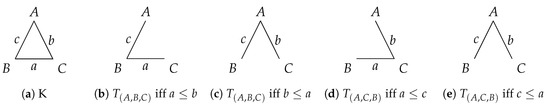 Assume , as otherwise the statement is trivially true. We first consider ; i.e., we consider the triangle (Figure 2a). We join B and C to A with B first and afterwards C (Figure 2b,c) or vice versa (Figure 2d,e):