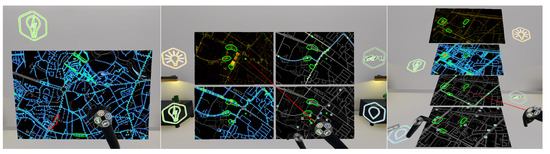 - Spur, M.; Tourre, V.; Coppin, J. Virtually physical presentation of data layers for spatiotemporal urban data visualization. In Proceedings of the 2017 23rd International Conference on Virtual System & Multimedia (VSMM), Dublin, Ireland, 31 October–2 November 2017; IEEE: Piscataway, NJ, USA, 2017; pp. 1–8. [Google Scholar] [CrossRef]