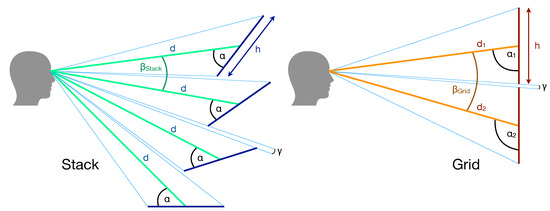 Spatial arrangement of the layers in the stack and grid systems, as seen from the side, highlighting the larger visual distance () between layers in the grid, assuming same height (h) of the maps, same minimum distance to viewer (), and same gap between layers (). The viewing angles () and distances (d) are constant in the stack and different in the grid, depending on viewer position.