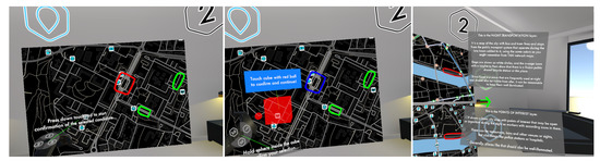 At first, all of the controller interaction is disabled. The tutorial system gradually introduced and enabled panning, zooming, and blitting the maps, and selecting and confirming candidates by asking the participant to perform simple tasks and waiting for their successful completion. While introducing the blitting mechanism, each layer was explained in detail—participants could not switch to the next one before confirming their understanding of the summary. The first such training scenario concluded with a reiteration of the common task of all scenarios: selecting and confirming one of the three candidate zones, followed by the instruction to take off the HMD and proceed with the questionnaire, which introduced the types of questions that will be answered throughout the session.