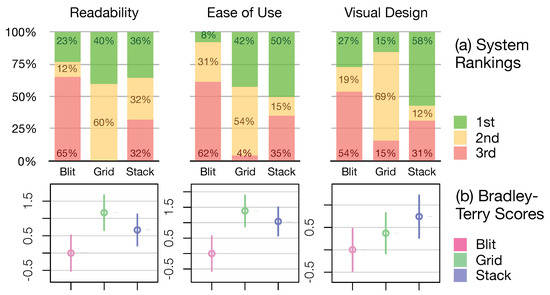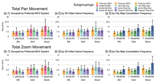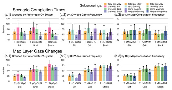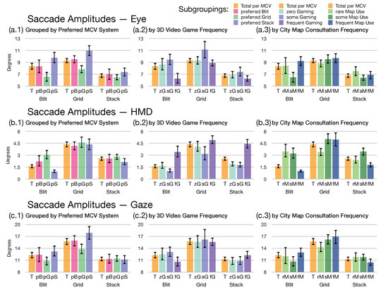 Although there are significant differences in visuo-motor behavior, fixation durations or saccade amplitudes do not directly translate to quality of the system. An exception could be the amount of head movement, as plotted in Figure 10b—more movement of the still quite heavy HMD will certainly lead to more strain and potential exhaustion, if continued over longer periods [50]. In this instance, the stack system clearly wins over the grid system in this regard—most likely due to its more compact layout, as we hypothesized. This layout is also likely to have caused the higher number of recorded changes in gaze from one map layer to another in the stack—to switch attention from the bottom layer to the one on top, the intermediary ones need to be crossed, inflating this number over that of the grid system. Even so, the number of gaze changes while using a system does not directly speak to the quality of it—higher numbers could indicate both a deeper process of comparison, as well as a higher state of confusion or disorientation, while lower ones could be indicative of more focus, or of a higher inconvenience of switching to different maps, as is definitely true for the blit system, which requires an additional controller input to switch.