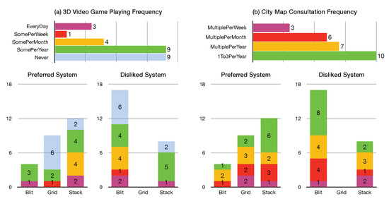 To provide an optimal experience for similar map comparison tasks, our results indicate that just optimizing and improving one system would not work universally. Different groups of the population appear to prefer opposing aspects of the different systems, depending on their experiences and behavior. A clear example for this were participants who frequently play 3D video games, and thus have probably greater experience with navigation in virtual environments. They showed a higher inclination to interact more deeply with the blitting and the stack system—they are both more “advanced” than the grid, in either requiring the use of controls to switch layers, or are arranged in a more unusual way than the simple grid. The grid, conversely, was by far the most popular system with participants whose video game playing frequency was the least, or nonexistent.
