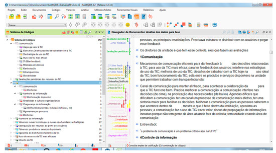 - Code generation for each interview according to the subjects or themes associated with the use of IT and the manager (the left-hand side of Figure 3 shows the system captured by the MAXQDA12 tool)
