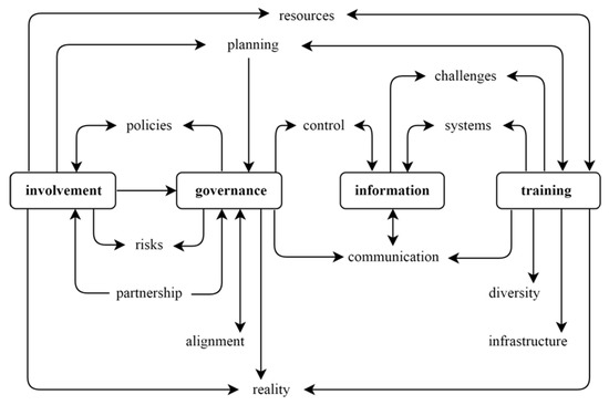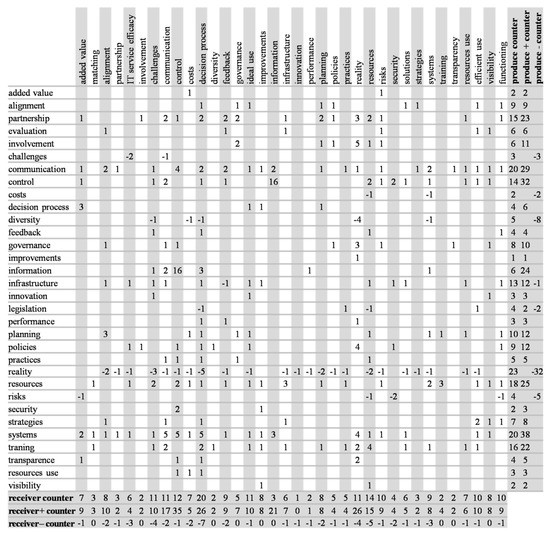 The perspectives that produce interference in other perspectives appear in the matrix lines, while the columns represent the perspectives that receive interference from other perspectives. Positive numbers express positive interference and negative numbers have the opposite interpretation. Blank cells indicate a lack of a direct relationship between the pairs of perspectives. Whenever an interviewee mentions a relationship between a pair of perspectives, the authors add 1 to the corresponding cell value, for positive interferences or −1 for negative interferences. Therefore, each cell’s value represents the number of times interviewees indicated a positive or negative interference between two perspectives. (For the sake of simplicity, authors omitted blank lines and columns). For instance, notice the absence of a relationship between ITG and other perspectives, which may indicate a low ITG maturity level in the organization. Figure 7 presents the global view of the relationship between perspectives in Table 3 through an interference matrix. If one respondent cites a positive interference and another respondent a negative for the same pair of perspectives, the methodology suggests returning to the respondents to seek consensus. It is important to note that such a situation did not occur in this study.