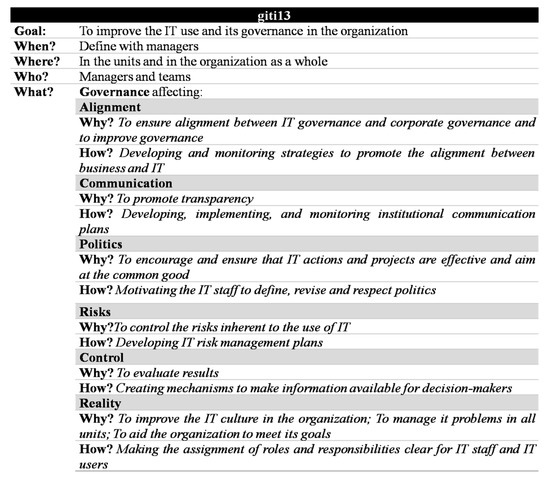 The lack of ITG maturity observed in the organization analyzed in this study is also the reality in other public organizations of developing countries, as stated in References [11,16]. Both works attributed to personal antecedents the lack of maturity and slowness for changes in such an organization. The theme exploited in References [16,17] is similar to the topic of this paper, analyzing the barriers to implement ITG in public sectors of developing countries.