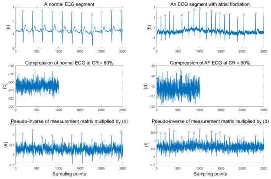 As shown in Figure 1, we take a normal ECG and atrial fibrillation ECG as examples. Figure 1a,b are a normal ECG segment and an atrial fibrillation ECG segment, respectively. In normal ECG, each heartbeat contains a P wave reflecting atrial activity and a QRS complex reflecting ventricular activity, and the R peak (marked by red circles in the figure) is the most prominent peak in each heartbeat. In AF ECG, the P wave disappears and is replaced by a continuous fibrillating wave, and the RR interval (interval between two adjacent R peaks) sequence is absolutely irregular. Usually, atrial fibrillation waves are difficult to extract due to their small amplitude and are easily disturbed by noise. Therefore, the RR interval sequence is more commonly used to automatically diagnose atrial fibrillation [19]. Figure 1c,d are the compressed data of (a) and (b), respectively, and the compression ratio corresponding to the measurement matrix is 60%. From the time domain waveform, the compressed data are not consistent with the dimension of the original ECG segment, and some waveform characteristics of the original ECG are not clearly shown in the compressed data. Thus, it is difficult to obtain some features of the original ECG only from the compressed ECG. Then, we multiplied the pseudo-inverse of the measurement matrix with the compressed data in Figure 1c,d to get the waveform in Figure 1e,f. This simple multiplication can be regarded as a crude reconstruction; of course, the signal is already seriously distorted relative to the original ECG. However, in fact, we can still see all the R peaks (red circles) in the original ECG from Figure 1e,f. This shows that, through a simple operation on the measurement matrix, we have actually recovered the positions of the R peaks in the original ECG. Therefore, it can fully benefit from the prior information of the measurement matrix and obtain the effective features of the original ECG to improve the classification performance of atrial fibrillation detection.