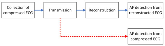 In a wearable health monitoring system based on compressed sensing, after the compressed ECG data are collected and transmitted to the remote devices, the original ECG signal is usually reconstructed first, and then the reconstructed signal is used for automatic diagnosis and analysis. The blue arrow in Figure 2 is the basic process of AF detection in a wearable health monitoring system based on compressed sensing. First, the compressed ECG signal needs to be collected on the wearable device using compressed sensing; then, the collected compressed data are transmitted to the remote device through a wireless connection; after receiving the compressed data, the remote device usually uses a compressed sensing reconstruction algorithm to reconstruct the ECG signals, and then uses the reconstructed ECG signals for automatic AF detection [22]. However, most of the compressed sensing reconstruction algorithms have high computational complexity. If the computing performance of remote devices is limited, such as smartphones or smartwatches, the reconstruction process will consume a lot of time. As a result, the real-time performance of AF detection is seriously affected.