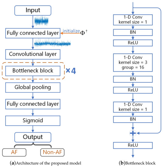 However, Zhang’s method ignored the measurement matrix, which is an important link between the compressed signal and the original signal. Based on a large amount of data and the powerful learning ability of deep neural networks, Zhang’s method has learned the mapping relationship between compressed ECG and AF labels to a certain extent. However, if the prior information of the measurement matrix is used to train the network model at the same time, then the network model may be easier to learn some important features about the original ECG, thereby improving the classification performance of the model.