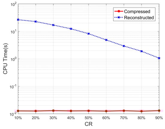 In addition, in the last two rows of Table 2, we list the average CPU time required by the two methods to detect AF for each ECG segment, where AF detection from the reconstructed ECG includes two stages of reconstruction and classification, while AF detection from the compressed ECG only includes the time required for reconstruction. As can be seen from the results in the table, the time required for AF detection from compressed ECG does not change much at different compression ratios, while the time required for AF detection from reconstructed ECG decreases with the increase of compression ratio. Most of the time consumed by the AF detection from reconstructed ECG comes from the process of ECG reconstruction, while the time required for ECG classification is very little, which leads to a difference of two to three orders of magnitude in the average CPU time required by the two methods. In order to show it more intuitively, the average CPU time of the two methods with different compression ratios is represented by the curve graph shown in Figure 4, and the vertical axis of the CPU time in the figure is represented by a logarithm. It can be clearly seen from the figure that the CPU time of AF detection from compressed ECG is two to three orders of magnitude less than that of reconstructed ECG. In addition, the higher the compression ratio, the smaller the size of the measurement matrix, and the matrix operation during reconstruction will be simpler, resulting in less time for reconstruction. This is why the blue curve in Figure 4 decreases as the compression ratio increases.