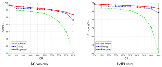The results in Table 3 show that the proposed method is very close to Zhang’s method in all the evaluation metrics when classifying the original ECG. However, in the classification of compressed ECG, the classification performance of the proposed method is better than that of Zhang’s method at various compression ratios. Taking the F1 score as an example, the F1 scores of the proposed method are 98.02% and 93.40% at a compression rate of 10% and 90%, respectively, which are 0.69% and 5.31% lower than that of the original ECG. Correspondingly, the F1 scores of Zhang’s method are 96.25% and 88.17% respectively, which is 2.18% and 10.26% lower than that of the original ECG. That is to say, when the measurement matrix was ignored, Zhang’s method lost more classification performance than the proposed method at the same compression ratio. Since our proposed method makes full use of compressed ECG and measurement matrix, the classification performance loss caused by signal compression is much smaller.