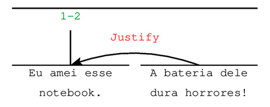 In this analysis, one may see that the second segment “justify” why the author of the text says that s/he loved the notebook. The arrow leaves from the less important segment (called “satellite”) and points to the most important one (the “nucleus”) of the relation. The nuclear segment is also visually signaled by the vertical axis in the representation. The “justify” relation is a nucleus-satellite relation, but RST also includes multinuclear relations, without satellites. In these cases, the relation does not have a particular span which is more central in the related text (e.g., “list”, “contrast” and “same-unit” relations, etc.).