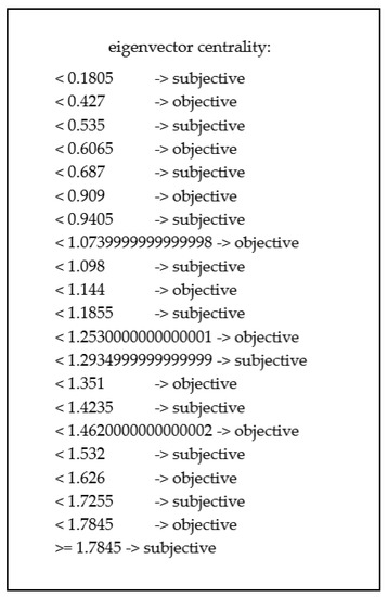 OneR indicates that the EigenVector feature is the most relevant one in the dataset (in fact, for the centrality-based features, the feature selection process in the previous section also indicated it as the most relevant one). However, it is not possible to establish a clear separation between value ranges and classes. For instance, one may see that if the EngenVector value is below 0.1805, the subjective class is assigned to the instance, but, if it is above this value but below 0.427, the objective class is indicated, and the classes keep changing places for each of the following value ranges.