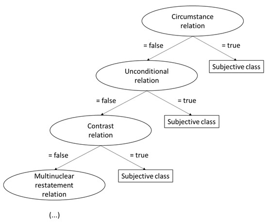By analyzing the learned rules by the PART technique in Figure 4, it is possible to confirm again the relevance of the discourse relations. For instance, the first learned rule also checks the occurrence of the circumstance relation: if it happens, then the subjective class is assigned to the instance; the second rule tests 10 features, where 7 of them are discourse features.