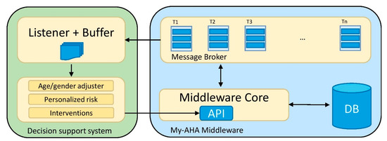 Further, the Bayesian approach allows us to build a modular risk model which can be updated according to evolving scientific findings and further collected data. A similar method to these analyses used during the My-AHA project and more detailed information can be found in the work from Niederstrasser et al. [34]. Figure 2 shows a schematic visualisation of the interaction between middleware and DSS.