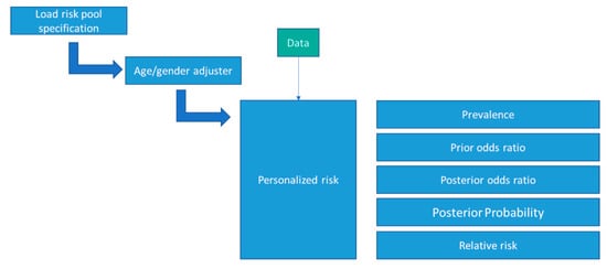 Next, the DSS initiates a multi-step computation process, including a pre-processing task to load a risk pool specification and run an age/gender adjuster. This process is depicted in Figure 3. There, an initial risk is loaded from a pool and the users are categorised by their age and gender. Afterwards, the personalised risk is computed in several different steps. Initially, the prevalence data for age and gender are individually calculated according to the extracted nonlinear weighted regression models for each domain. Next, the probability is converted into an odds ratio (prior odds ratio) which is combined into value for all domains (posterior probability). The relative risk for the user can be given, which is depending on the aimed domain and the individual user data. Five Risk values (Frailty, Falls, Dementia, Depression and Loneliness) are calculated in 4 different domains: Cognitive, physical, psychological, and social. Finally, the outcomes are pushed back to the middleware, from where they can be visualised in participants dashboards (Section 4.5.2 shows examples of these outcomes). Since these outcomes are treated as a standard user metric, a history of the risk values can also be visualised to track its evolution over time.