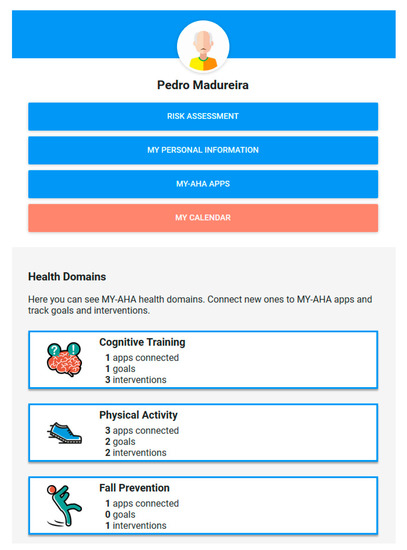 Currently, My-AHA can fetch data from the following platforms: Smart Companion, an application developed by Fraunhofer Portugal AICOS that besides other features includes an advanced activity tracker and fall risk predictor [39]; VitaDock [40] by Medisana that provides through a vast set of sensors a wide variety of data: activity (e.g., steps, distance, and energy) and sleep tracker, blood pressure, pulse, blood glucose, insulin, carbohydrates, body weight, body temperature, oxygen saturation; CognHome provides scores and all the metadata related with cognitive games; iStoppFalls [41] provides activity data and fall risk scores resultant from the exercises and games played with the platform; Fitbit [42] provides macronutrients data from food logging application and activity data registered by the Fitbit activity tracker.