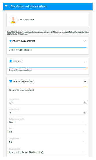 It was built as Single Page Web Application with responsiveness as the main driver in its developments to boost its accessibility since the end-users could be in the group of people which are not very familiar with the usage of technology. The technological approach allows performance similar to traditional native apps inside the web browser. The website is loaded entirely at the beginning, and the only network calls necessary to guarantee its functionalities are calls to API methods for the My-AHA middleware to retrieve/store data. The technology used for the development was React.js [35] alongside with Redux [36], and for handing the responsiveness of the interface React-FlexBox-Grid toolbox [37].