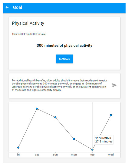 Figure 9 shows an example of the goals screen for the domain of physical activity. The default goal for physical activity follows the World Health Organization guidelines of physical activity for adults aged 65 years or above which recommends at least 150 min of moderate-intensity aerobic physical activity throughout the week [48]. The user can manually increase this default goal to the value it finds accomplishable and is also given the hint that for additional health benefits, the user should increase their moderate-intensity aerobic physical activity to 300 min per week.