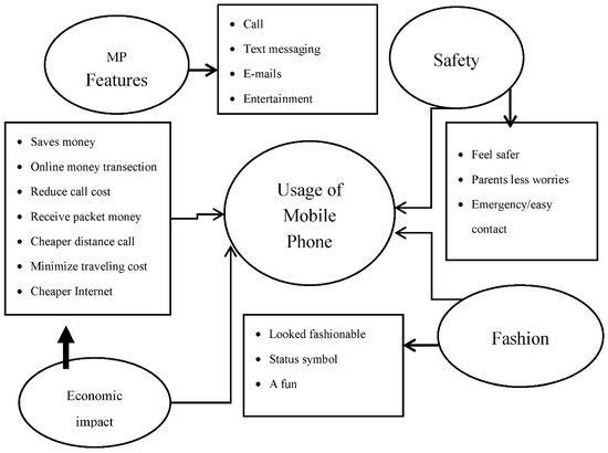 A theoretical framework was developed for the current research based on the literature review which is a guideline and a conceptual map for this research (Figure 1). Four major categories were identified, such as mobile phone (MP) features, the use of mobile phones for safety, use as a fashion symbol and mobile phones’ impact on economic factors [3,4,13,18,19,20,21].