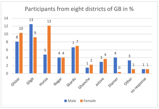 For the question asked regarding personal or family income, 5% participants responded that they have their own income sources (online earning), 94% responded that they have family income and 1% did not respond to the question (Table 1). The participants from the eight districts are shown in Figure 3.