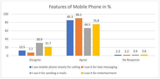The mobile phone is one of the technologies which releases users from the restriction of space and time, but at the same time, it has deteriorated the present limitation of social norms [48]. Previous research showed that mobile phones not only have an impact on economic factors but also have a negative impact on young people’s norms and values in the society. The researchers in [49] showed that students use mobile phones for social networking and entertainment, which has economic implications. Overall, 92% said that they use mobile phones for sending text messages, while 86% said that they use them to check emails. Most young people use mobile phones’ latest features for getting information and sharing knowledge [50,51], which shows that they are an essential component for college and university students [52].