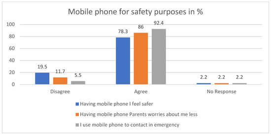 The third conclusion is that both males and females utilize mobile phone for safety purposes (feel safer, parents worry less about them and contact in an emergency) [47]. Due to current security threats of Pakistan, most of the parents worry about their children, both males and females; that is why 97% of young people own a mobile phone and positively use it for safety. They regularly inform their parents about their whereabouts.