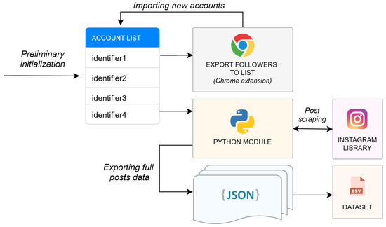 To build the dataset, we first collected a preliminary list of Instagram account identifiers, from which the full posts are extracted. The steps required for this process are depicted in Figure 1: starting from the preliminary list of accounts, we exploited a browser extension (https://instagramhelpertools.com/) for Google Chrome to export—for each of them—the full list of followers. Therefore, we iteratively extended the list of accounts, until a sufficiently large number of accounts was reached. Then, we leveraged our software module, developed in Python, to remove duplicates and filter accounts according to the following specifications: first, we selected ordinary profiles only (i.e., those with less than 25,000 followers); second, we required that each selected account has at least 100 published posts; and, third, we discarded accounts with private visibility.