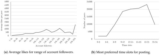 Overall, the final dataset we collected thus consists of 106,404 rows, for a total of 2545 different users. On average, each user has 2071 followers. Finally, in Figure 2, we show some statistics related to the considered accounts: in particular, the sub-figure (a) shows that the average of achieved likes per post is, in proportion to the followers, higher for smaller accounts, whereas (b) outlines the typical publication times chosen by these accounts, in which the 18:00–21:00 time range appears to be the most popular one.
