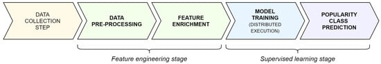 In such a context, approaches aimed to predict the popularity of social content are gaining increasing attention, not only from a commercial and industrial standpoint, but also from a scientific perspective. Indeed, thanks to the advancement of knowledge in the fields of data analysis and artificial intelligence, together with the development of new techniques based on Machine/Deep learning, Reinforcement Learning, Natural Language Processing (NLP), Data mining, Big Data, etc. [1,2,3,4,5,6,7], it is now possible to provide advanced tools for companies and individuals, and promote the consolidation of these businesses in the social market. For this purpose, such tools and techniques usually aim to extract hidden information that may be exploited in several directions, spanning from targeted advertisements to political strategies.