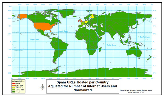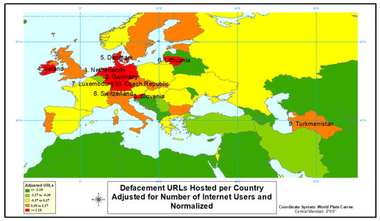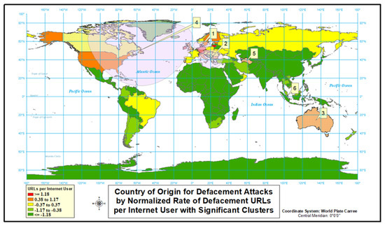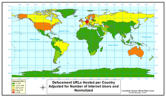 First, we look into the defacement cyber attack type in our analysis. According to the results depicted in Figure 1, Figure 2 and Figure 3 and given in Table 2, the highest rate of defacement attacks originate in Europe. Each rate is defined as (cyber attack counts)/(internet users count). All of the world’s highest normalized rates (“red” countries) are present in Europe, as well as most of the countries with normalized rates (“orange” countries) above the mean. Outside of Europe, Turkmenistan, Australia, and the United States are the only countries with above average rates of defacement type malicious URL attacks. Turkmenistan is the only country outside of Europe to be placed in the top 10 countries when ordered by normalized rates. It is also worth noting the importance of using rate data. If simple count data had been used, 8 of 10 countries in the table would have been replaced.