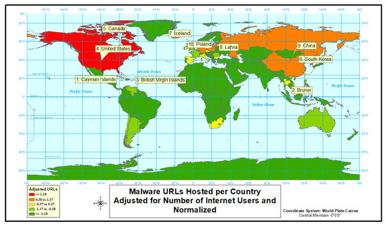 Second, our analysis focus on malware type cyber attacks. The data show a much greater diversity for the normalized rate of malware type attacks than occurred with defacement (Figure 4 and Figure 5 and Table 3). North America accounts for all of the highest normalized rates except for Brunei. The Cayman Islands, British Virgin Islands, and Brunei are hard to depict in the figure due their relative small size and the scale of the map. Even though normalized rates are used for rankings, seven countries would still be placed in the top 10 based on count data alone.