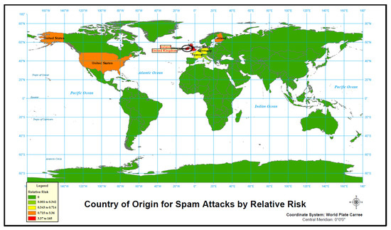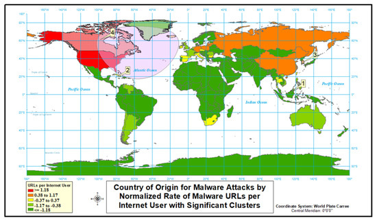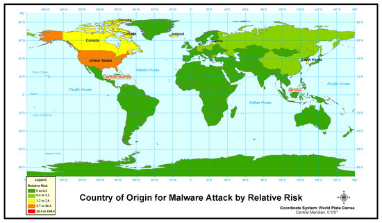 Heat maps were used to visualize geographic data patterns, especially in conjunction with cluster maps. Since our research objective was to study the origination of malicious URL cyber attacks, we created heat maps by country for both the rate of attack and relative risk. The clusters obtained from SaTScanTM were overlaid on these heat maps with ArcMap.