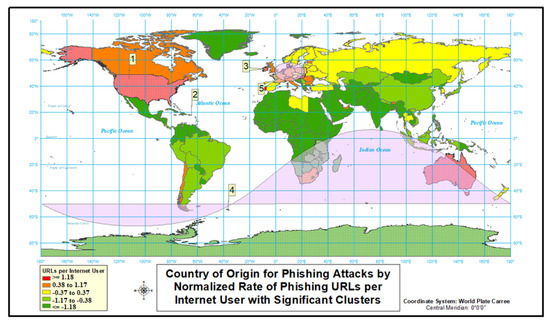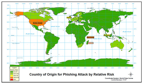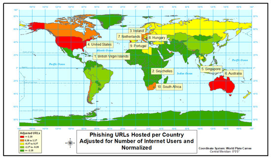 Third, we look into phishing cyber attacks. Even more than malware, the country of origin for phishing-type attacks is diverse, and there is no geographic relationship when using normalize rate (Figure 6 and Figure 7 and Table 4). Four of the ten highest rate countries would also be present in a list of top 10 countries for the number of phishing-type attacks. Nine of ten countries listed for phishing-type attacks are in the highest rate category (“red”); this is highest percentage of any type of attack.