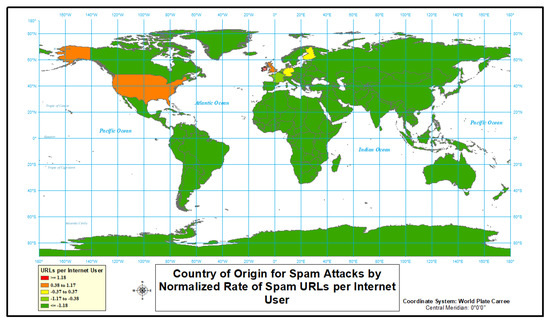 We used cyber attack data obtained from the Canadian Institute for Cybersecurity (CIC) [28], and the details of the dataset can be found in Reference [8]. Mamun et al. developed a lexical analysis to detect and categorize malicious URLs. The data came from disparate internet sources from web crawlers, web spam dataset repository (from the Web Laboratory of the University of Milan), open source OpenPhish website (a widely recognized global website for phishing information), the DNS-BH website of malware collections, a random selection of URLs from a website with a list of defaced URLs. The fact that these data came from multiple sources, properly categorized, and publicly available repositories that are open for inspection and close scrutiny provides ample evidence to support the credibility of the dataset. The results were a categorization of over 110,000 URLs from year 2016. We used the resulting categorized data to perform a spatial analysis of the country of origin for each type of attack. One limitation of this study is that the authors did not attempt to identify or correct any errors in identification or categorization of potentially malicious URL made in the original data. The data from the CIC is publicly available, and the authors downloaded a dataset titled “URL dataset (ISCX-URL-2016)” [28].